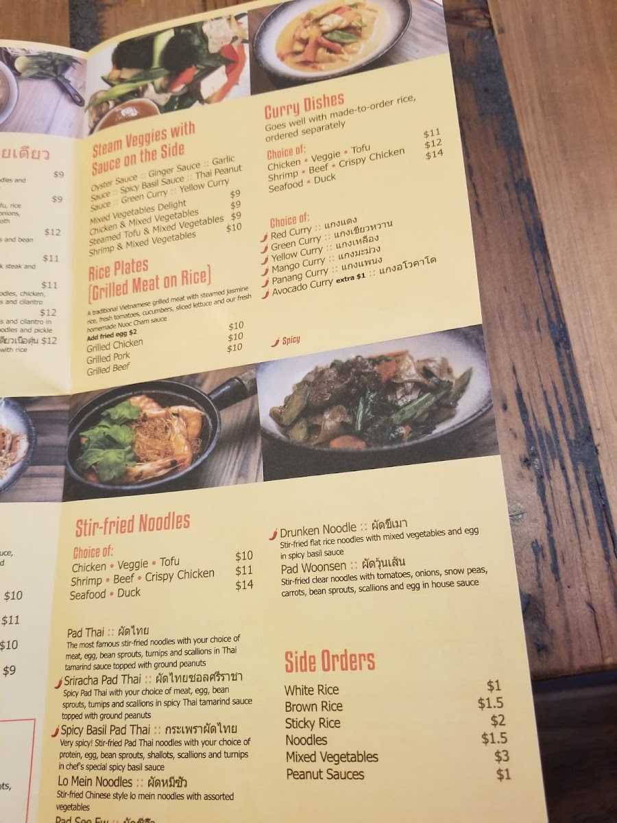 stir-fried noodle with your choice of meat, egg, tofu spice, turnip, bean sprout, scallion in Thai tamarind and spicy lemongrass sauce topped with ground peanut.