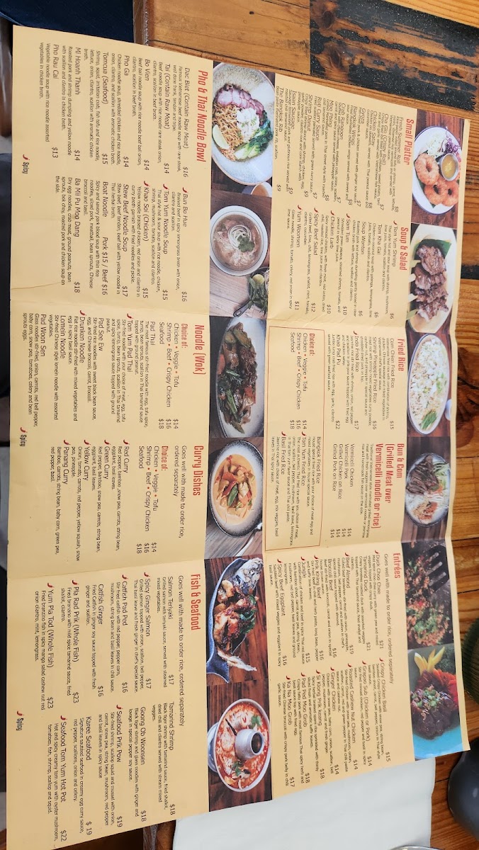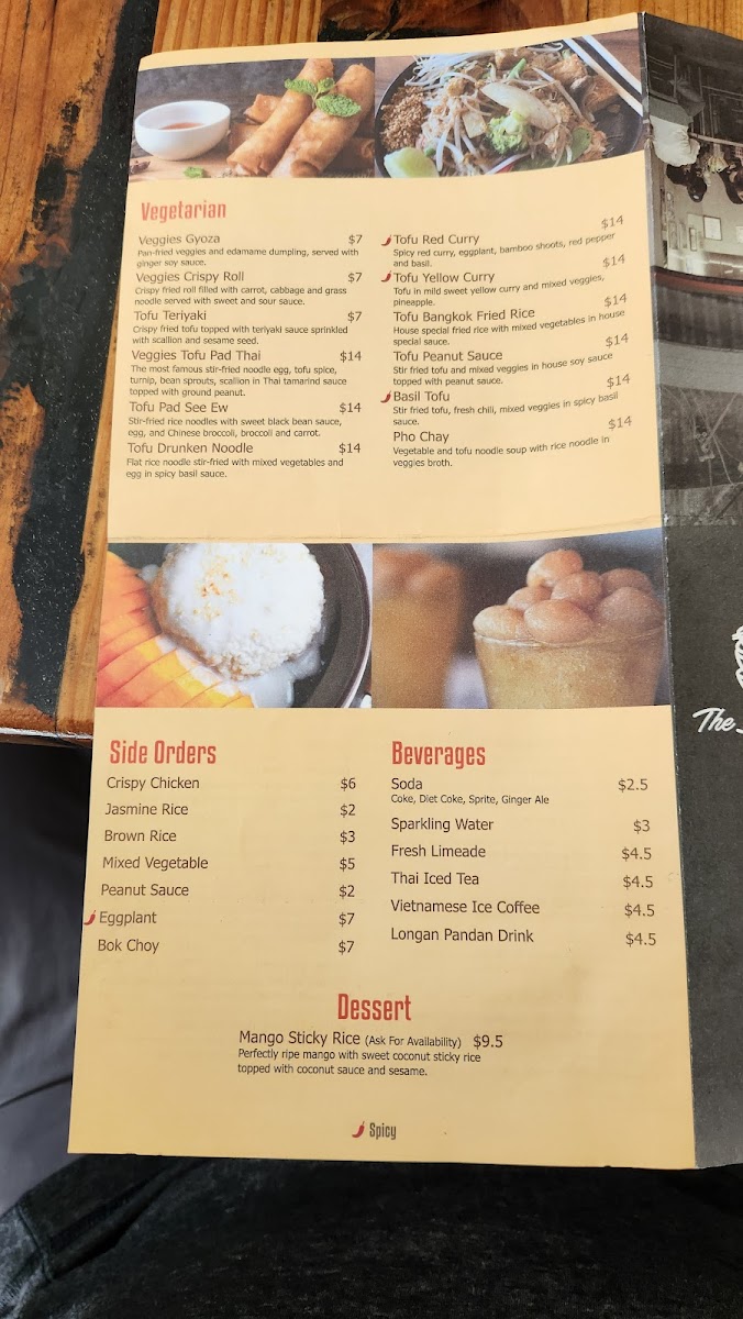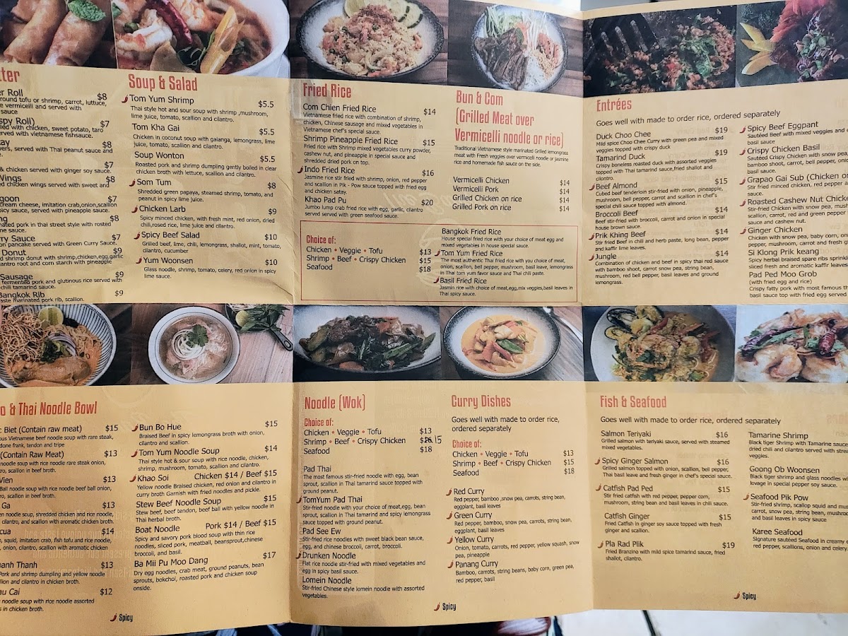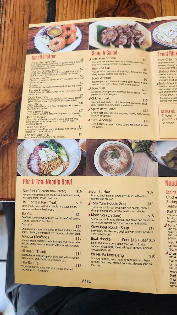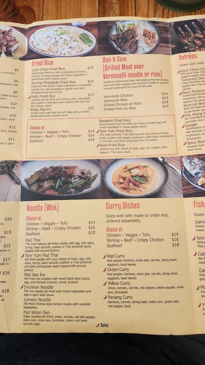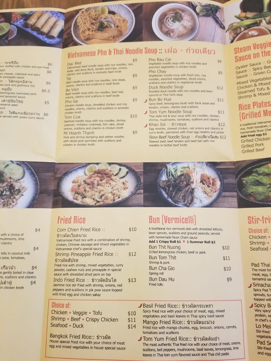 The most authentic Thai fried rice with you choice of meat, onion, scallion, bell pepper, mushroom, basil leave, lemongrass in Thai tom yum favor sauce and Thai chili paste.