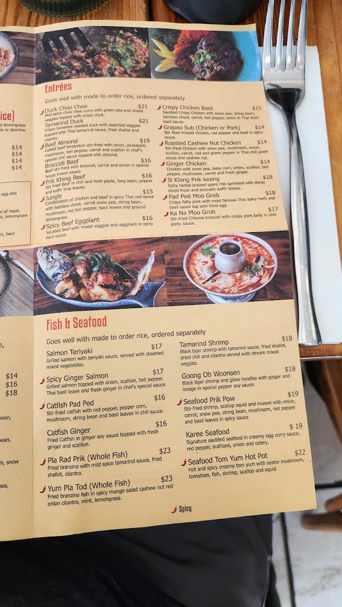 Fried whole bronzini fish in spicy mango salad cashew nut red onion cilantro, mint, lemongrass.